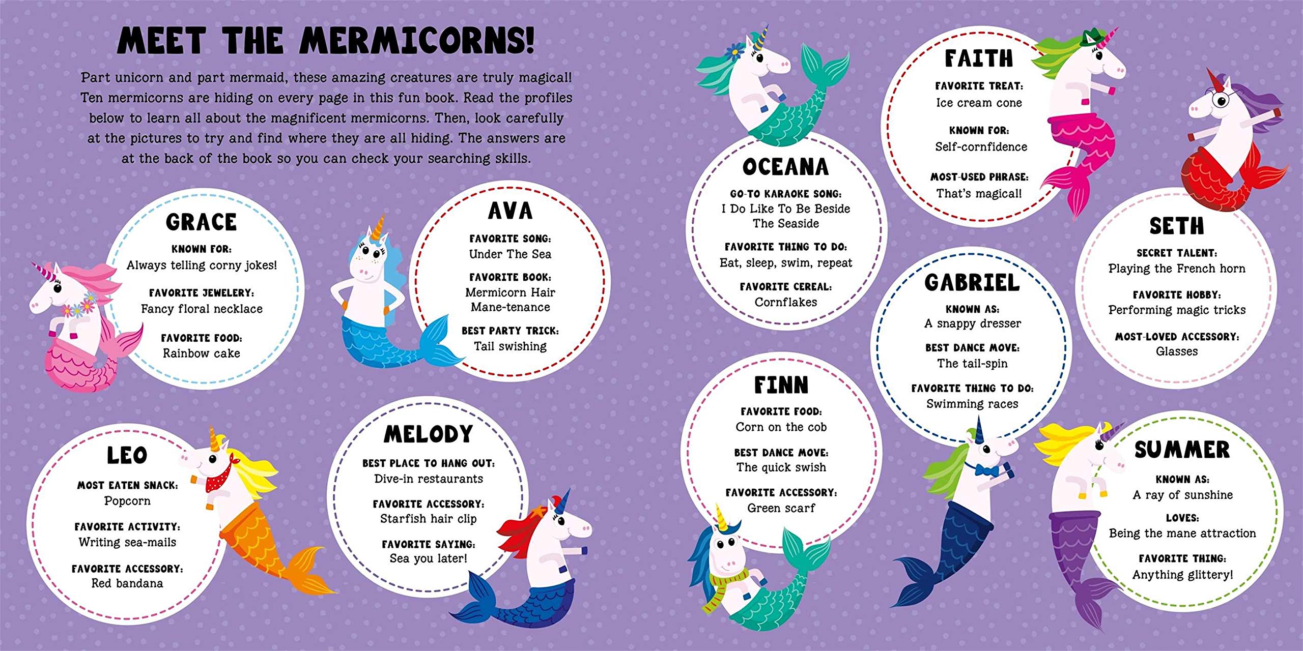 ספר חפש ומצא זה מלא בקסם והרפתקאות! הוא מזמין את הילדים לצאת למסע מופלא בעקבות 10 בנות קרן (משחק מילים של חד קרן ובת הים) יפיפיות, המשלבות את העולמות של בנות ים וחד קרן.