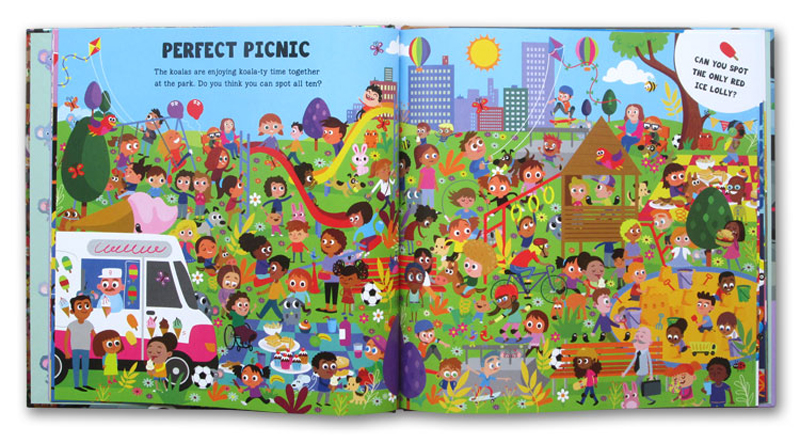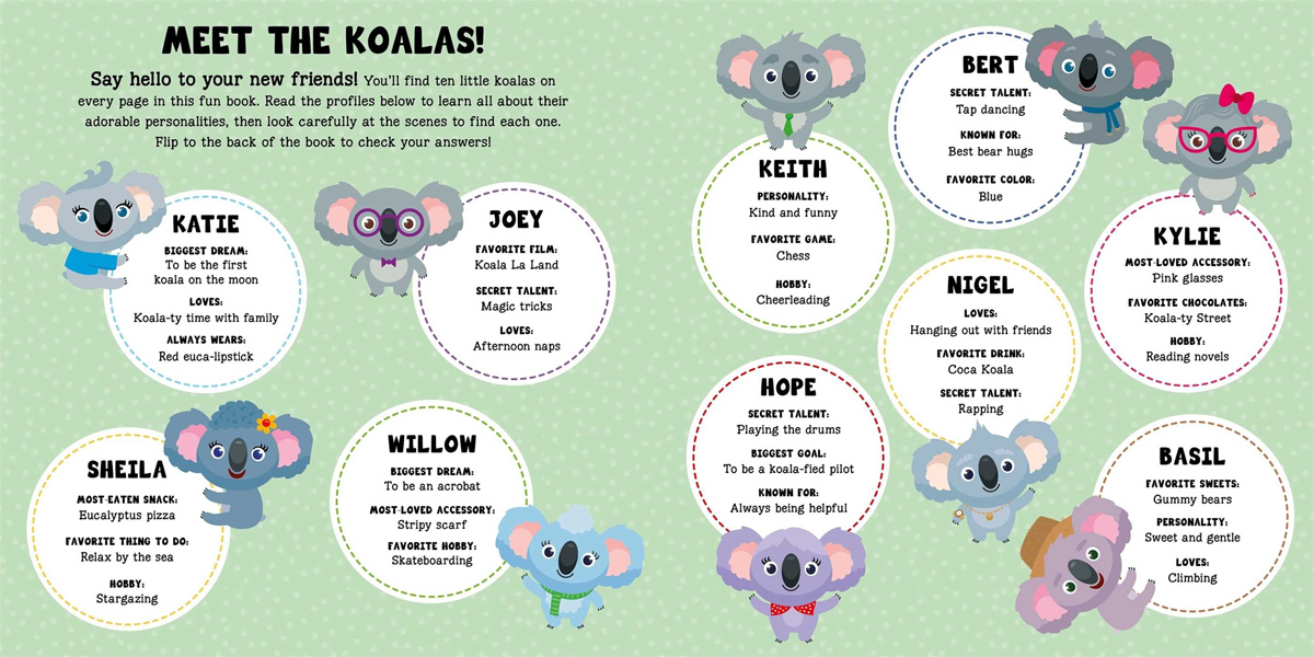 ספר חפש ומצא של  10 דובי הקואלה המקסימים שלכל אחד מהם מראה ואישיות משלו, אבל כולם כולם מסתתרים בכל אחת מעשר התמונות שבספר.