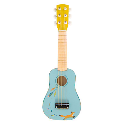 גיטרה מעץ לילדים מעוטרת בצבעים עדינים ואיור שועל