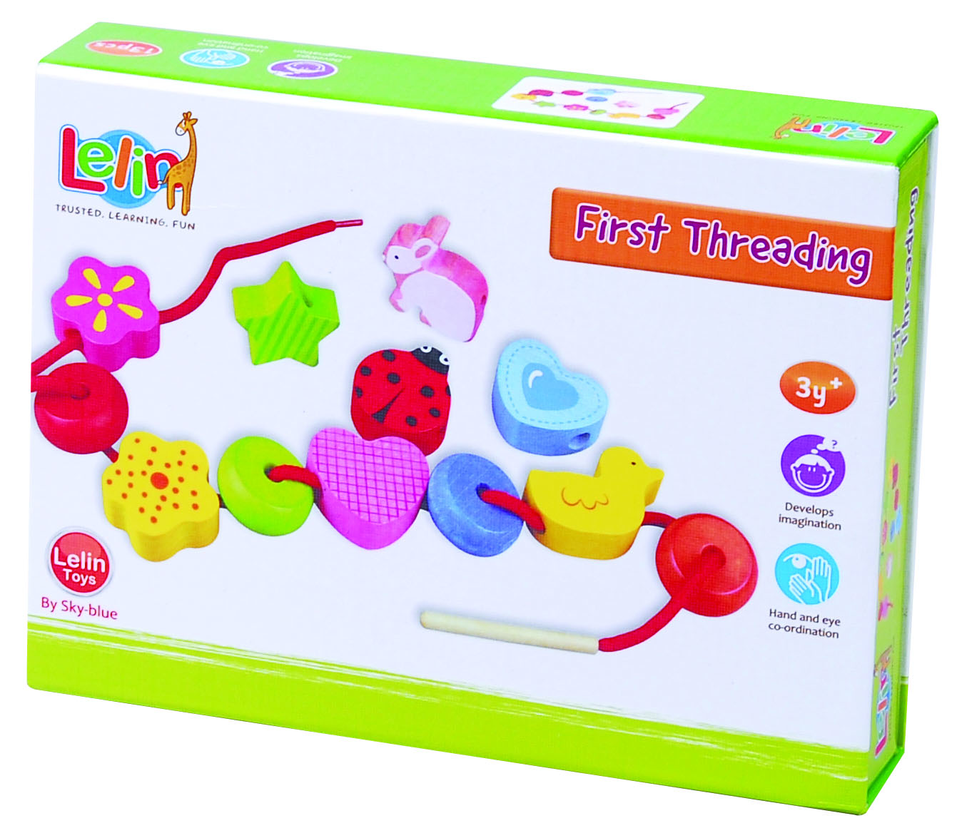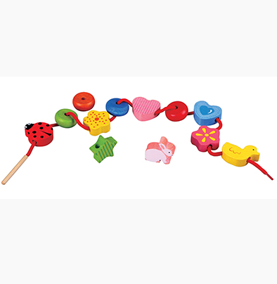 משחק השחלה לגיל שנה וחצי ומעלה הכולל חרוזים צבעוניים ויפים מעץ בצורות שונות.