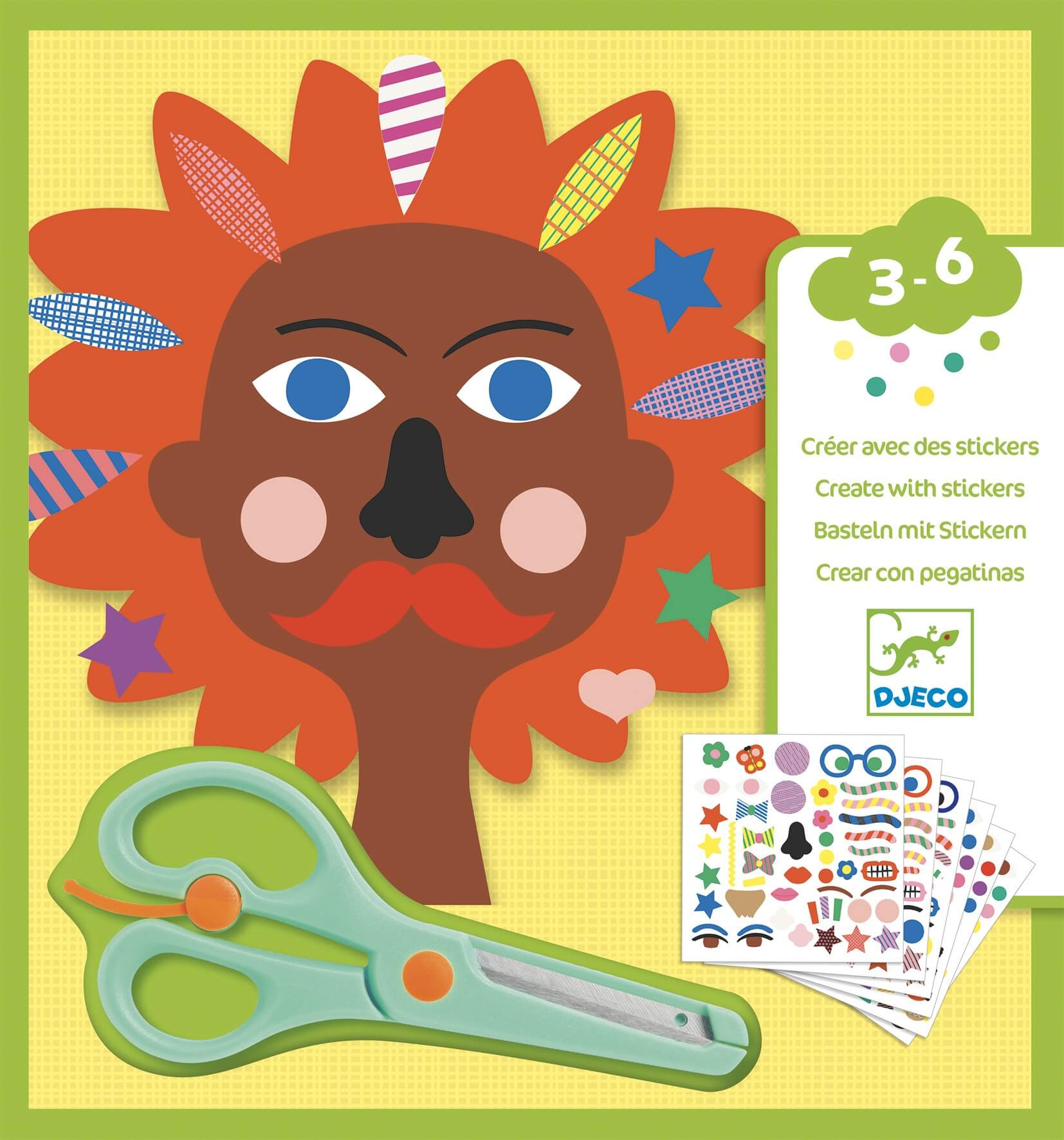 ערכת יצירה ובה ניירות עם הדפסים של פרצופים שונים, אותם גוזרים עם המספריים המצורפות.