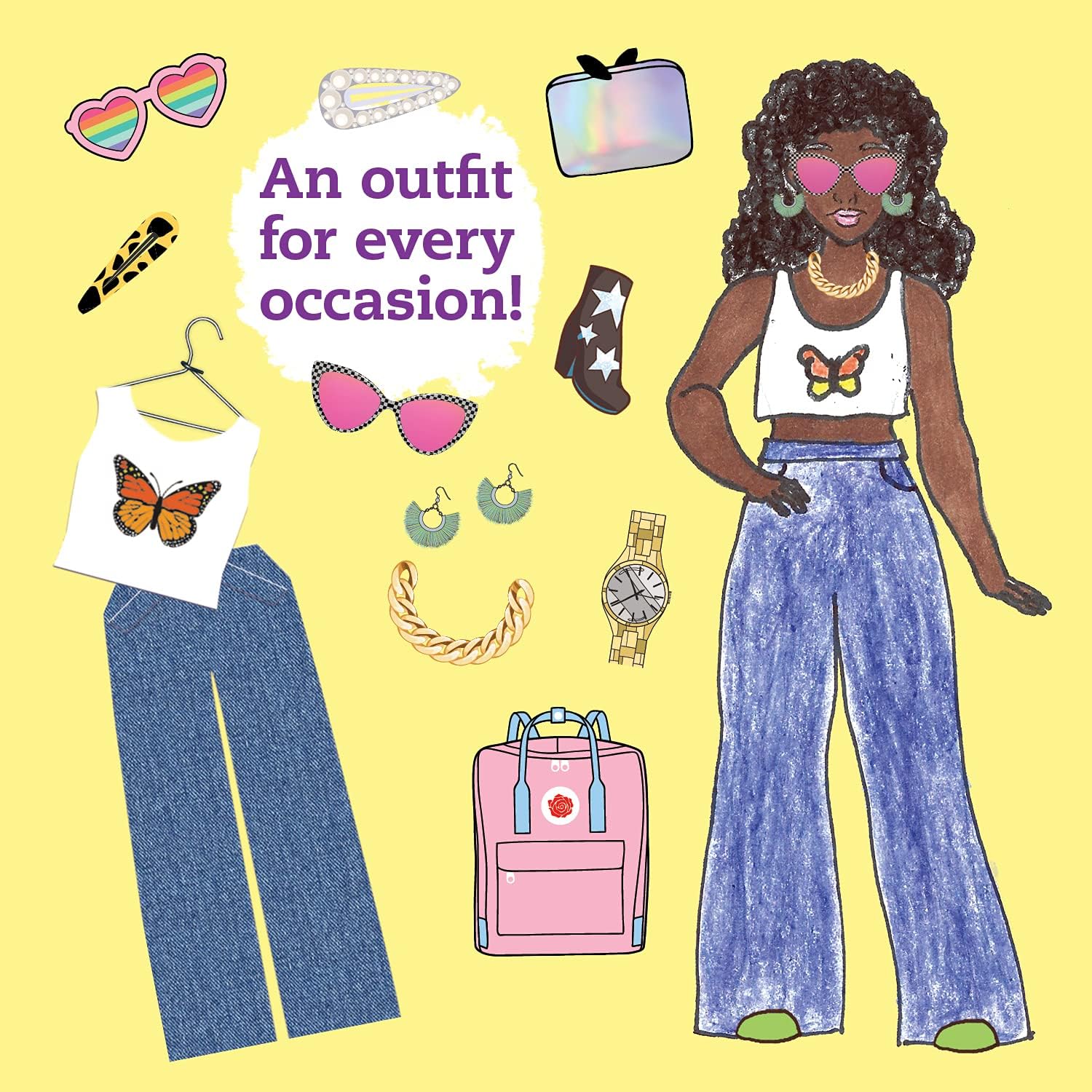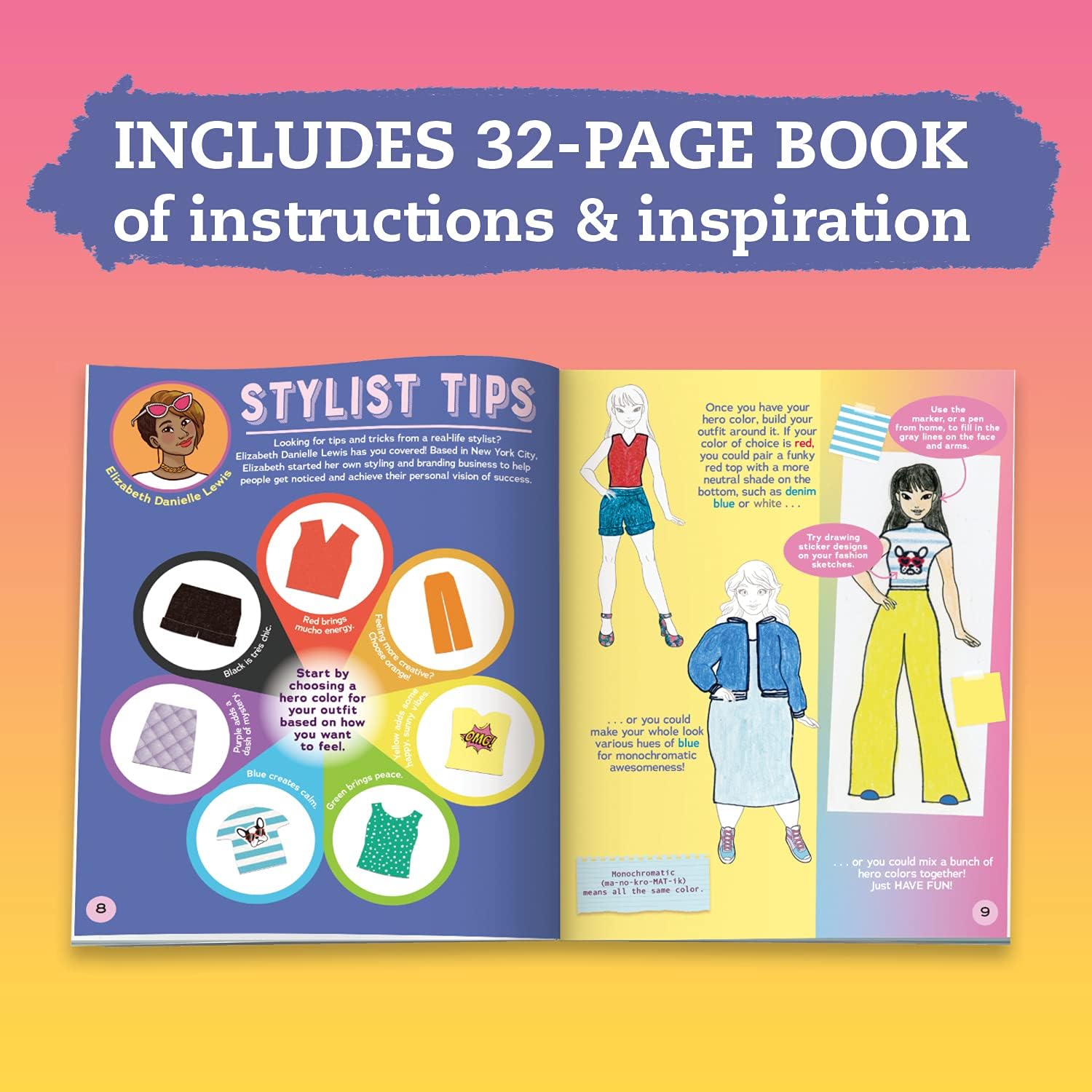 ערכהת היצירה לילדים כוללת: ספר 32 עמודים של הסברים והשראות, 10 קולבי מיני, פד נייר לשרבוט, 2 שבלונות אופנה, מתלה בגדים קל להרכבה, טוש, דבק, 12 דפי קישוט בהדפסים שונים ו119 מדבקות.