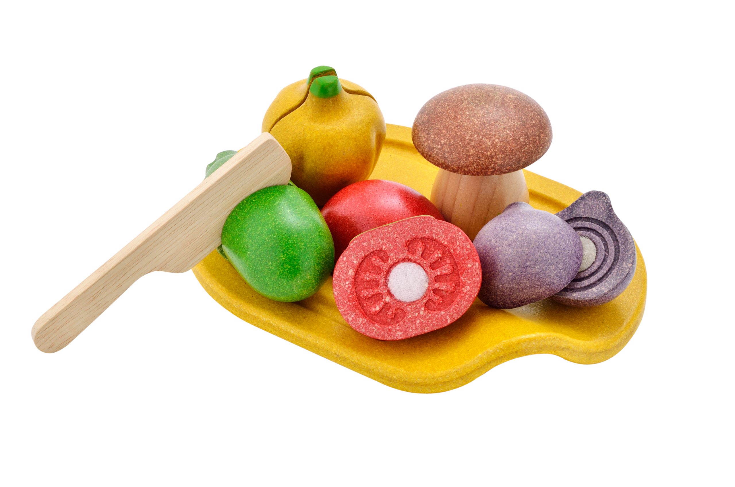 משחק חיתוך פירות וירקות מעץ הכולל סכין, מגש, פטריה, עגבניה, בצל, מלפפון וגמבה צהובה, החלקים מחוברים בינהם בסקוץ' אשר מופרד בעזרת הסכין.