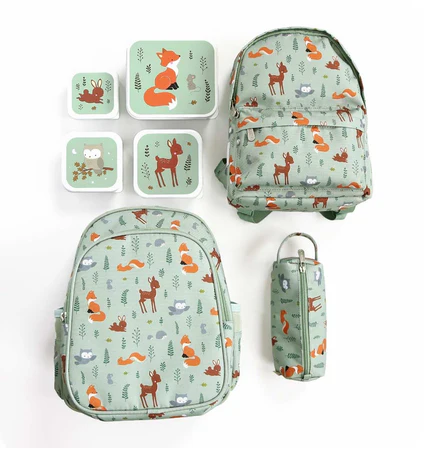 4 קופסאות אוכל לגן ולבית ספר בגדלים שונים עם איורי חיות יער.