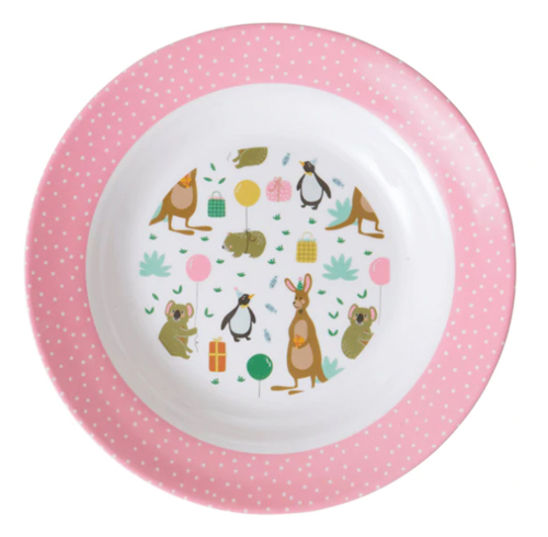 קערת מלמין רחבה מצויירת – מסיבת חיות ורוד