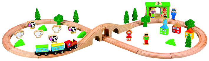 מסילות שניתן להרכיב ליצירת סיבוב חזרתי (שמונה), רכבת עץ עם שני קרונות שמתחברים במגנט, גשר, תחנה, דמויות, בתים, חיות, עצים ושיחים.