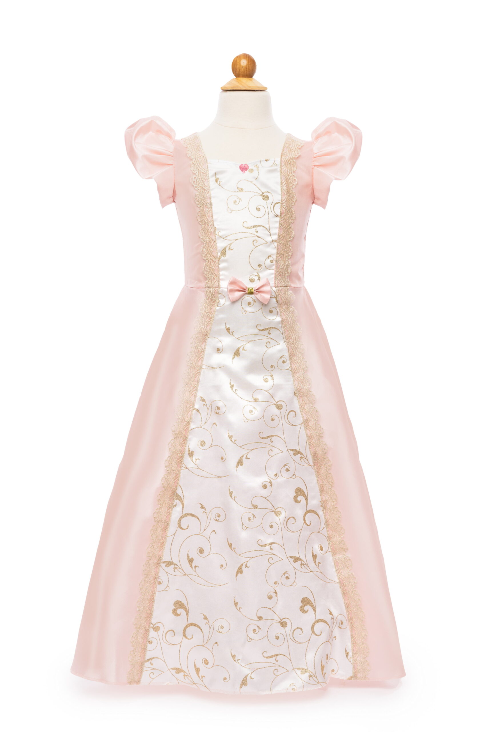 שמלת נסיכה מהאגדות בגוון ורוד עשויה מבד מבריק שיוצר מראה חגיגי וזוהר.