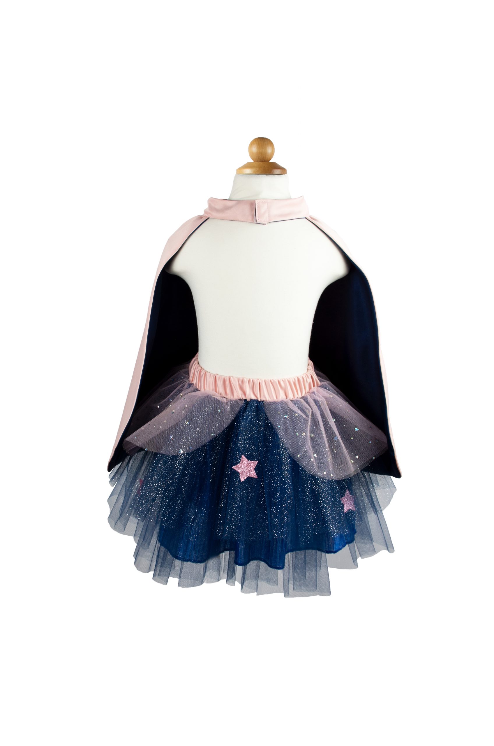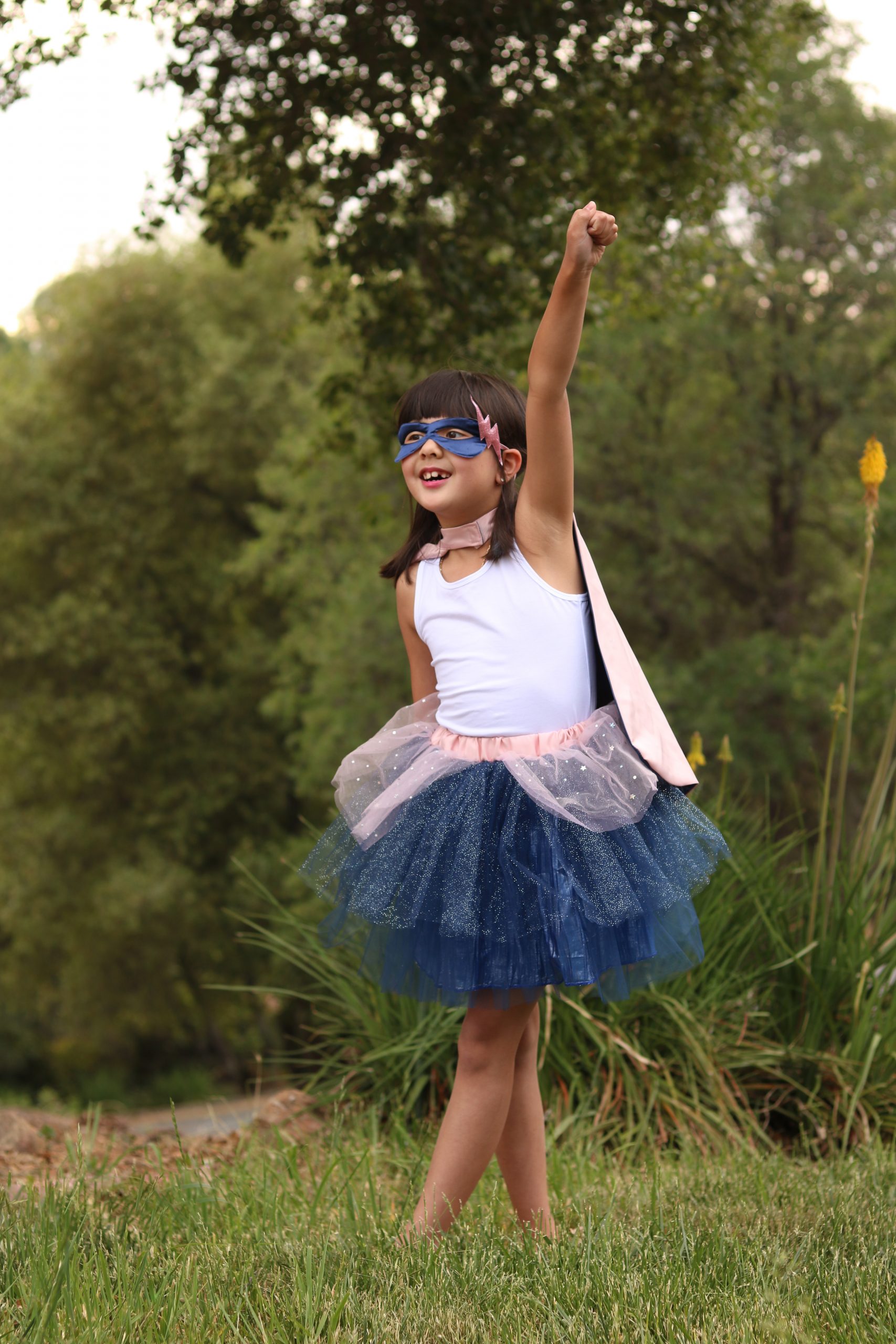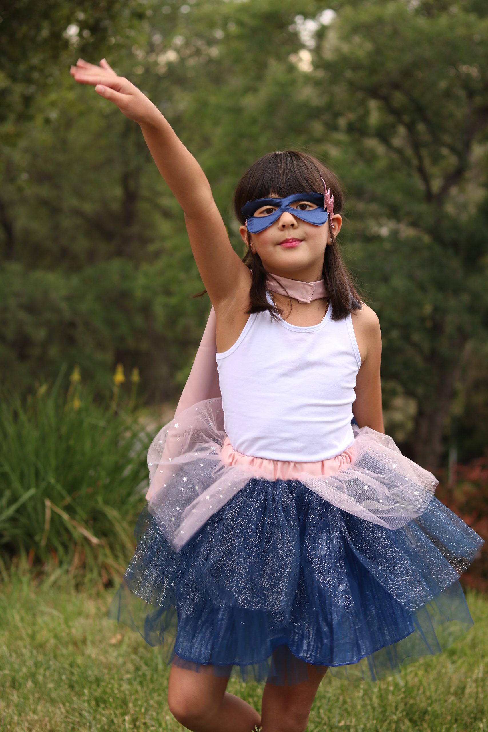 תחפושת גיבורת על כחול נייבי בשילוב ורוד – חצאית טול גלימה ומסיכה