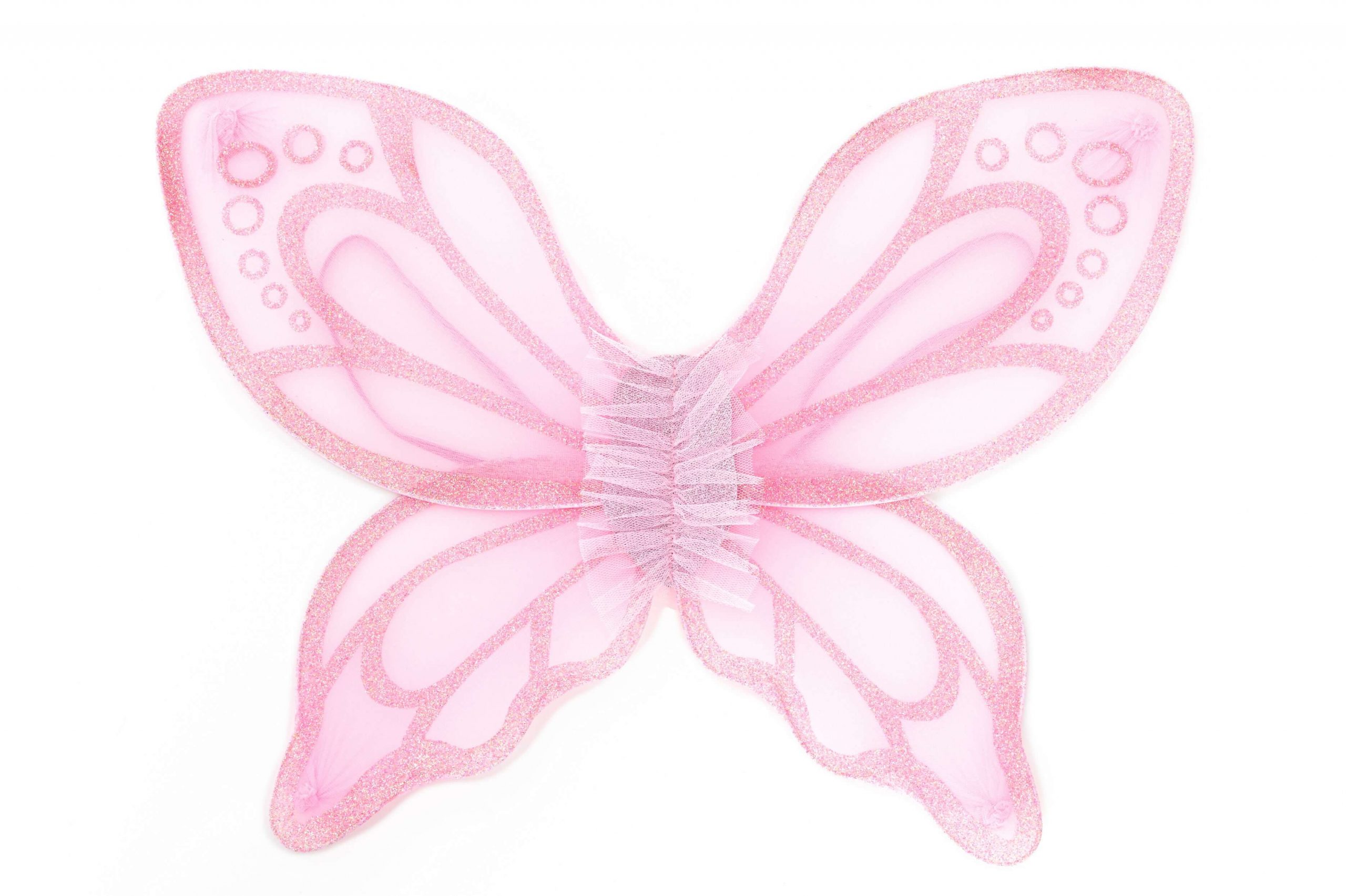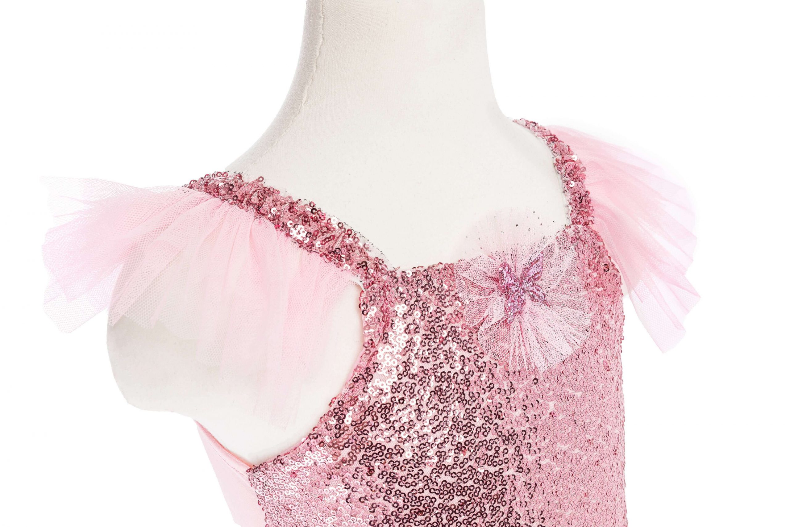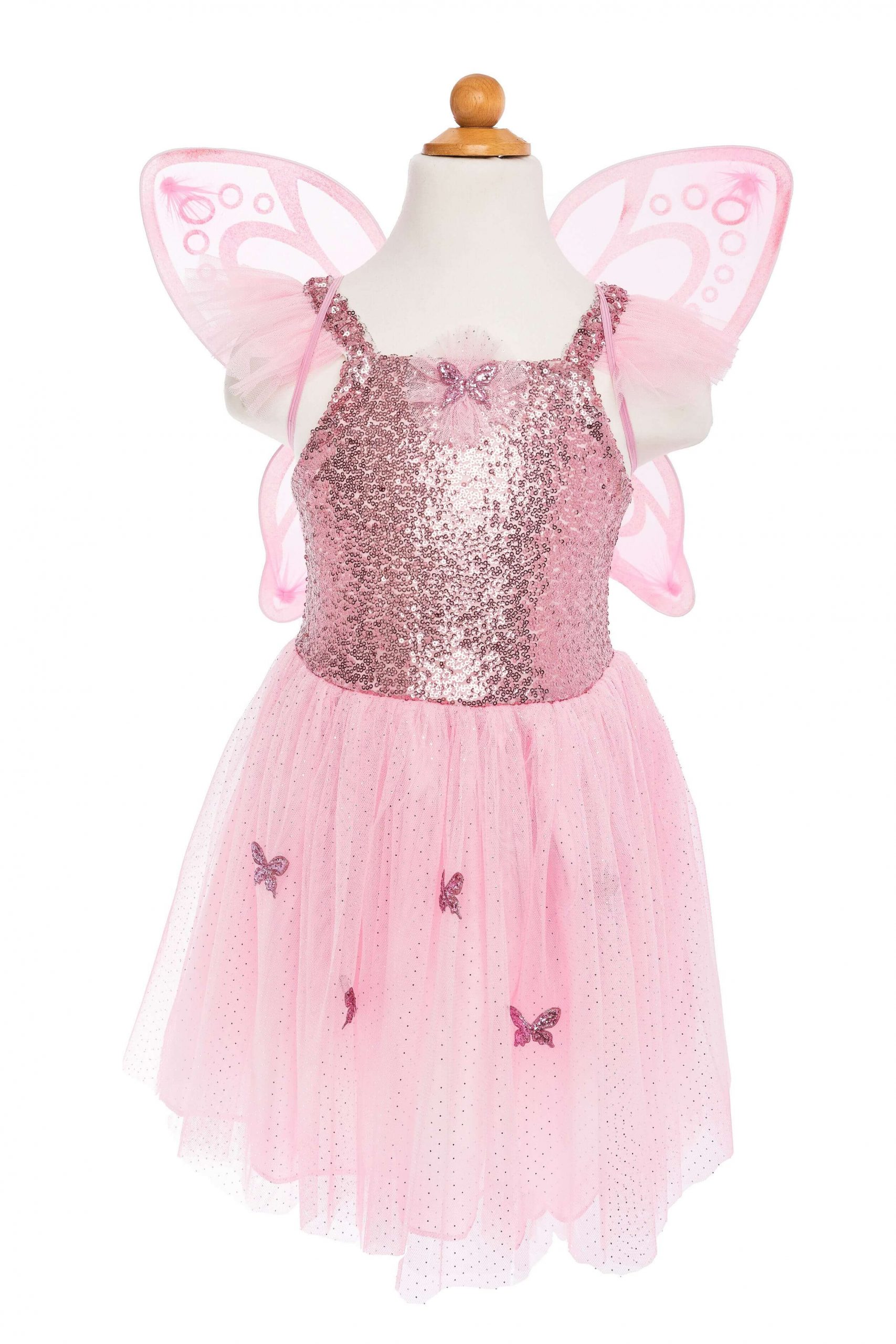 תחפושת פרפר שמלה ורודה עם פאייטים בעיצוב פרפרים וכנפיים.