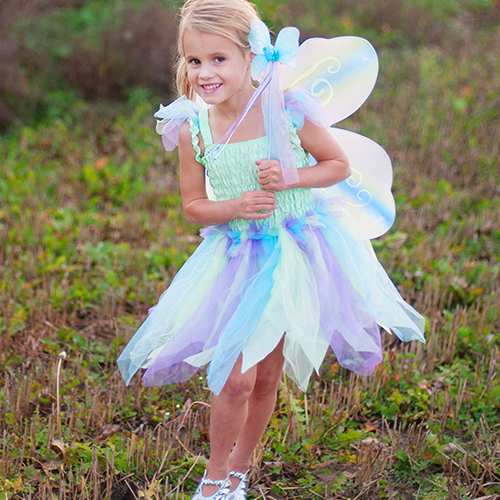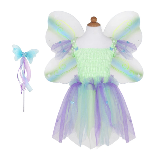 תחפושת שמלה סגולה ירוקה בתוספת כנפיים ושרביט.