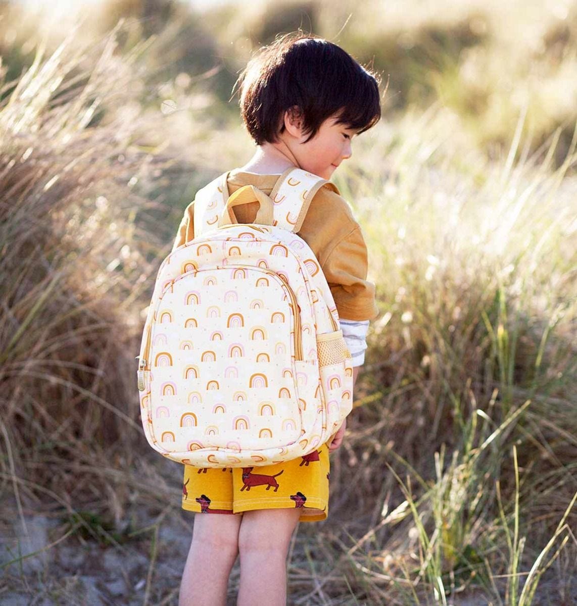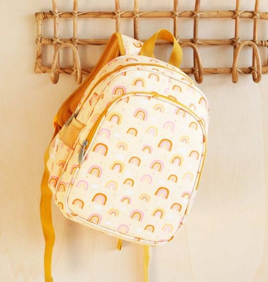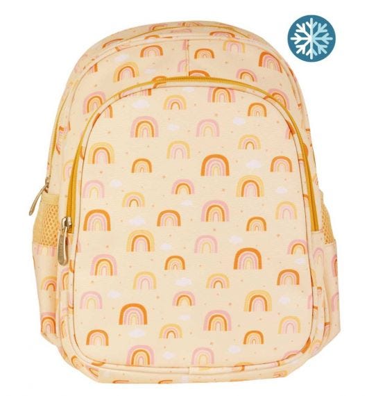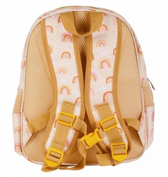 תיק גן גדול בצבע כתמתם עם איור של קשת בענן