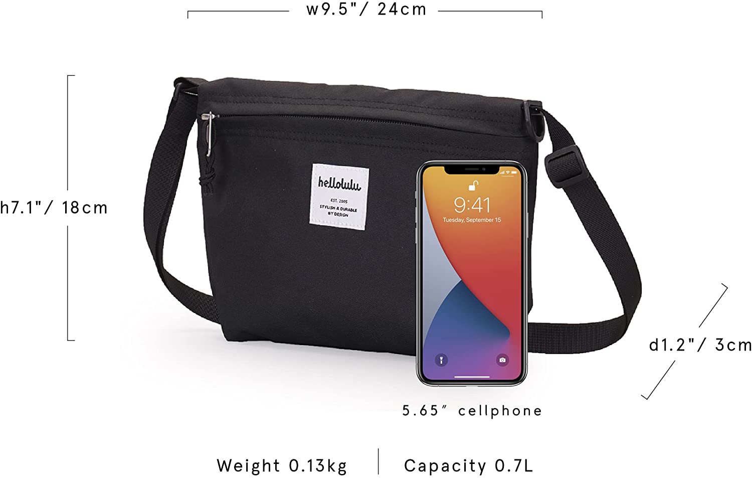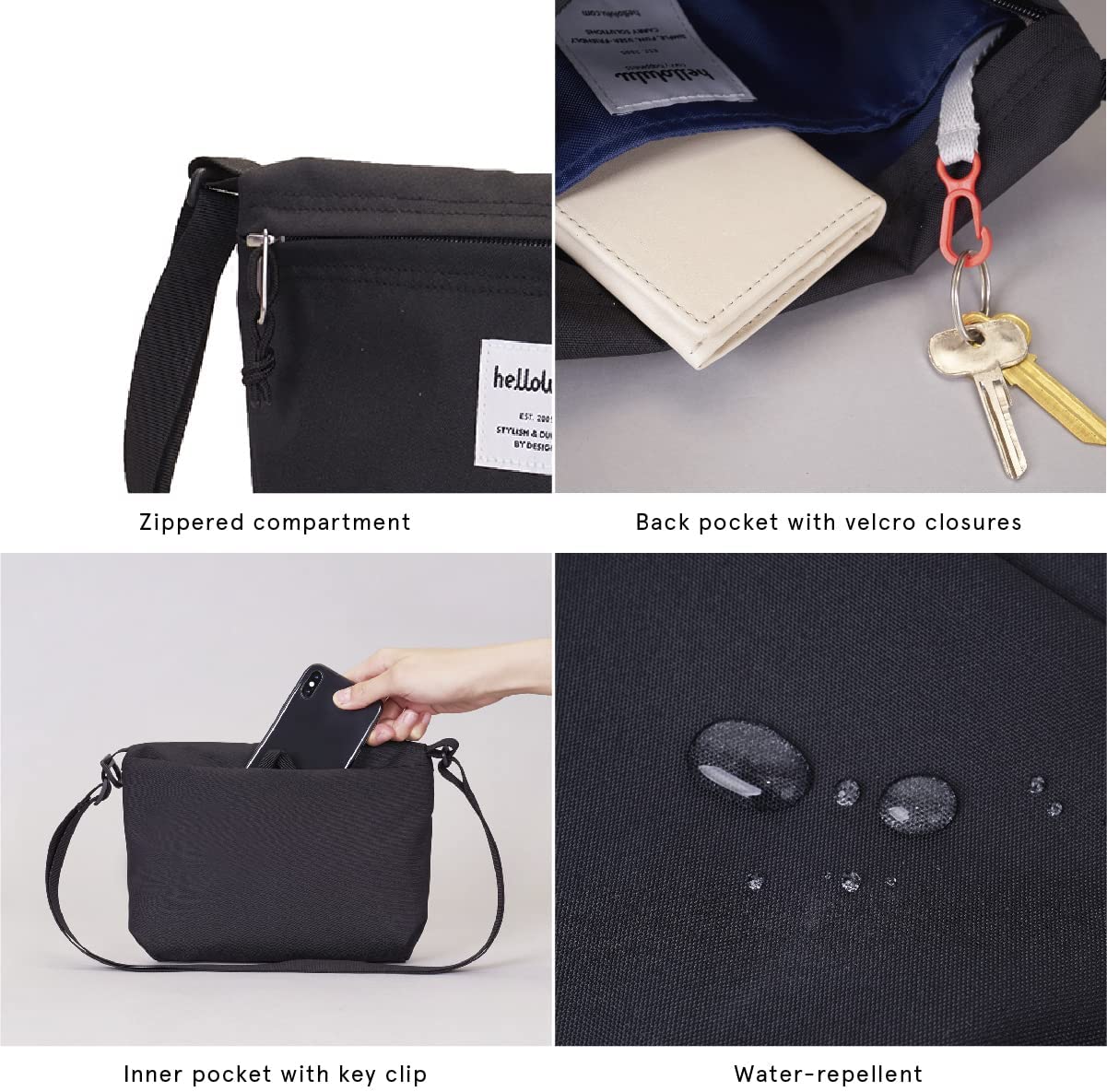 פאוץ' חמוד, קטן וקל הכולל תא מרווח שנסגר ברוכסן ומכיל תא פנימי עם תופסן למפתחות, כיס אחורי עם סגירת סקוטץ' ורצועת כתף מתכווננת.