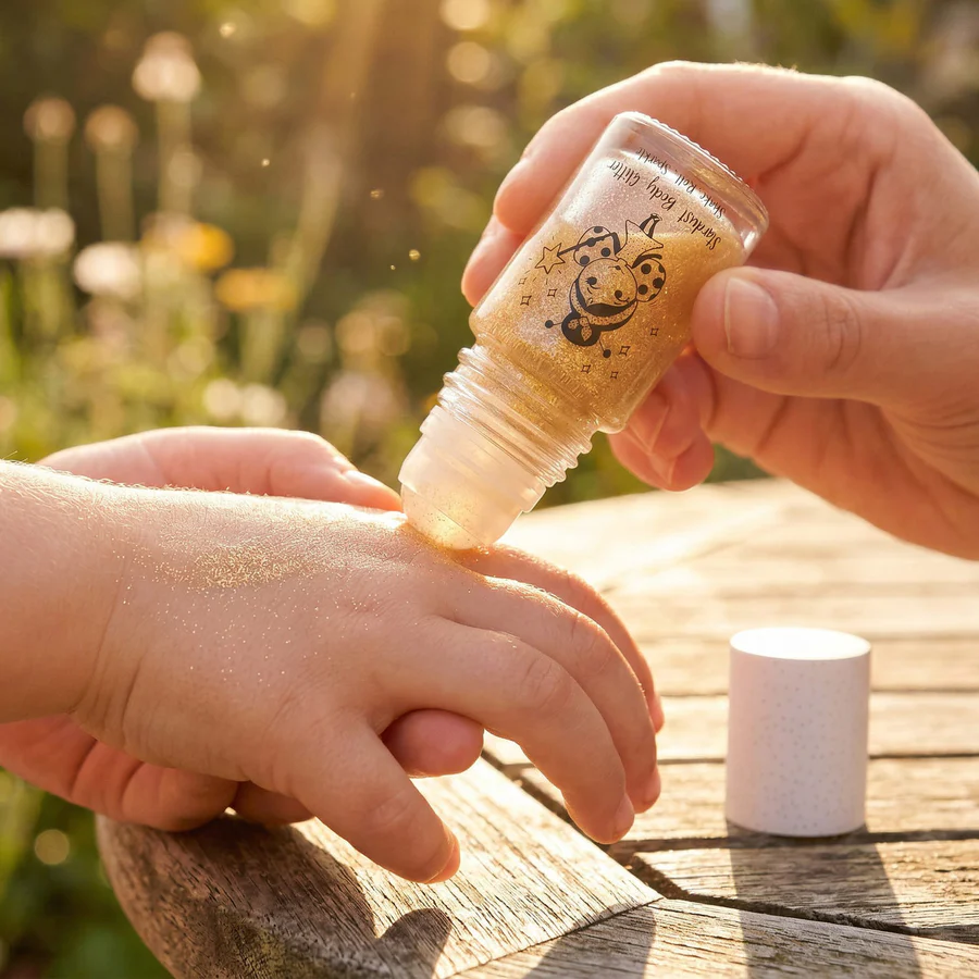 איפור גוף רול און של מיס נלה הוא גליטר גוף מהנה וקל לשימוש שמוסיף אפקט מנצנץ לעור.