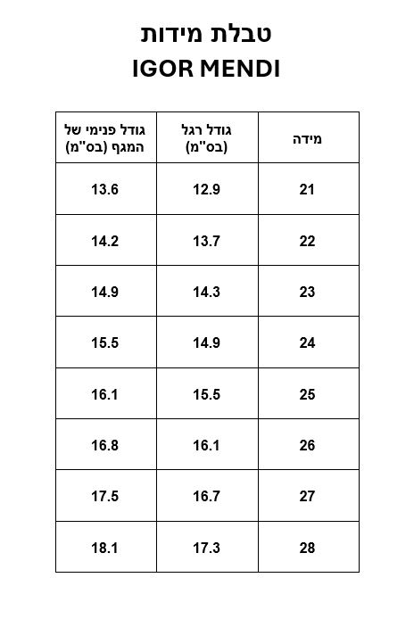 העזרו בטבלת המידות המצורפת בגלרית התמונות לבחירת המידה המתאימה לילדכם