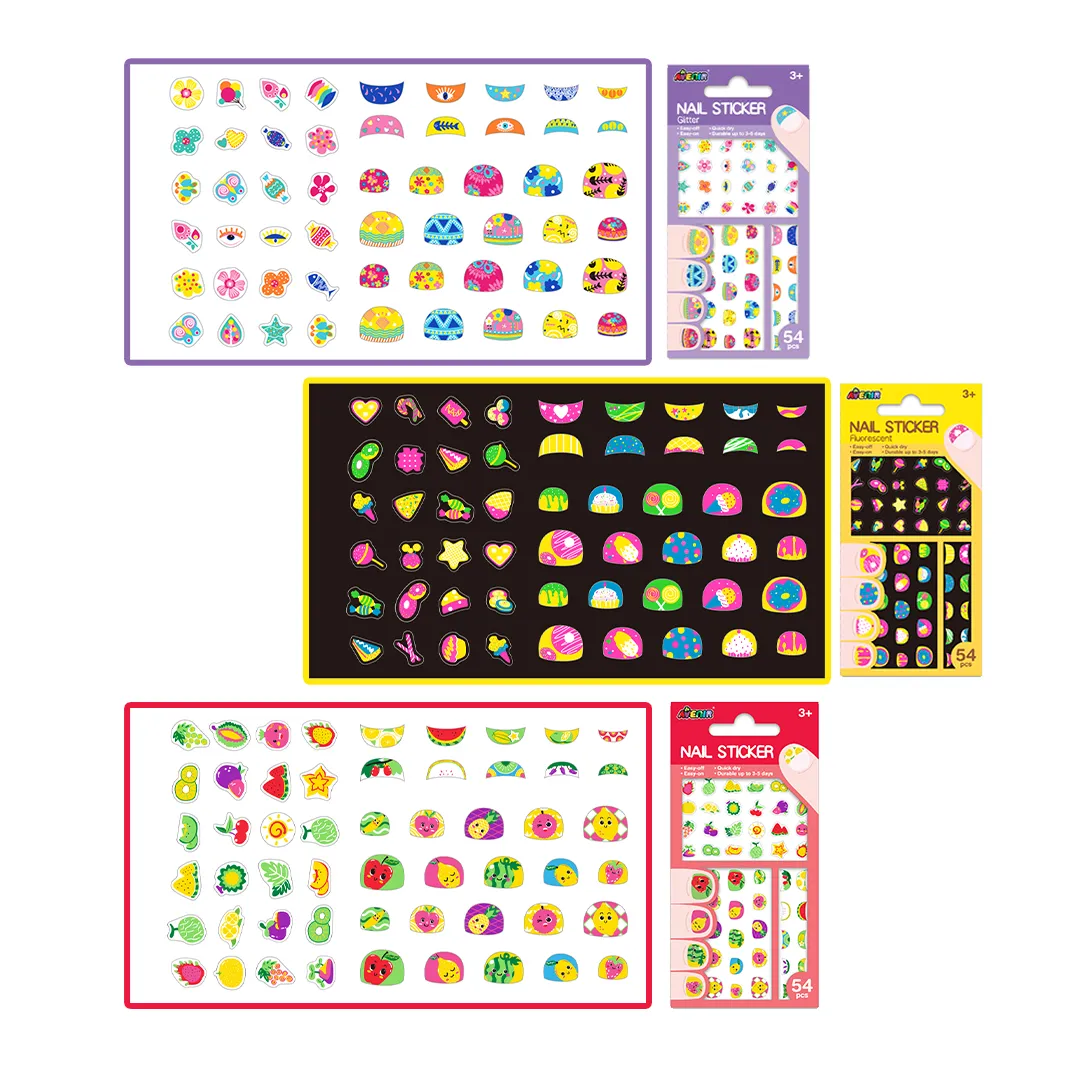 הסט כולל 54 מדבקות המתאימות לילדות ולילדים ולרוב מחזיקות מעמד על הציפורן בין 3-5 ימים.