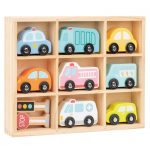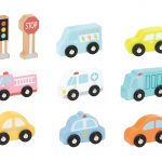 סט רכבים מעץ, כולל 8 רכבים ועוד 2 תמרורים.