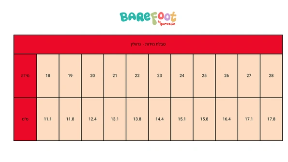 שימו לב – מצורפת טבלת מידות בתמונות. כדי להתאים את הסנדל למידה של ילדכם הניחו את כף הרגל על נייר חלק, ציירו את היקף הרגל ומדדו בעזרת סרגל ס"מ את האורך מהעקב לאצבעות.