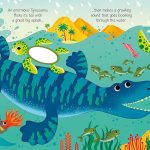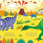 ספר צלילים לתינוקות בנושא דינוזאורים עם פתחי הצצה לעמוד הבא.