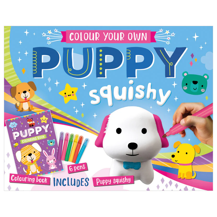 הערכה כוללת סקווישי בצורת כלב שאותו ניתן לצבוע עם הטושים המצורפים.