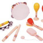 סט כלי נגינה לילדים הכוללת טמבורין, מקלות הקשה, מרקס, קסטניטות ופעמונים.