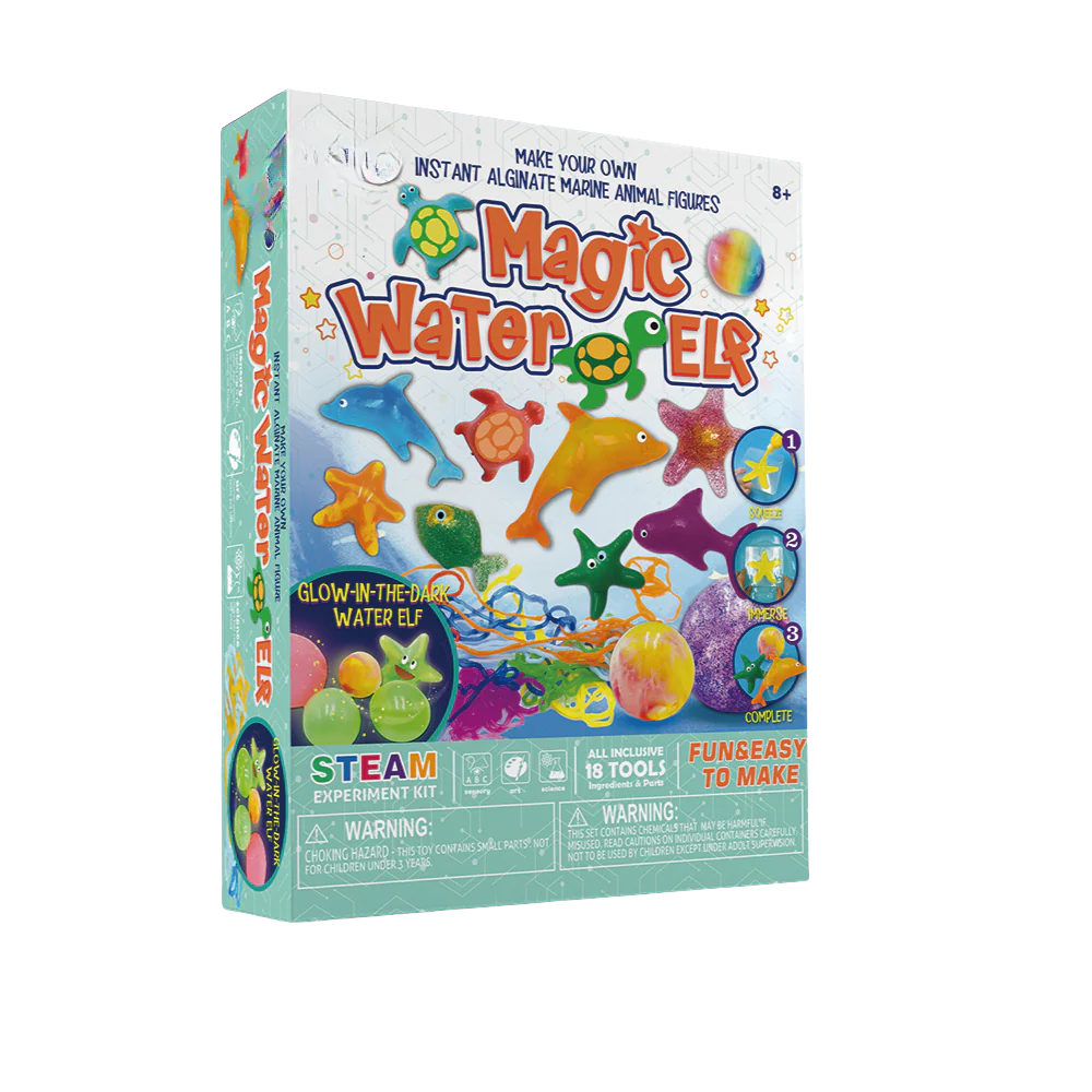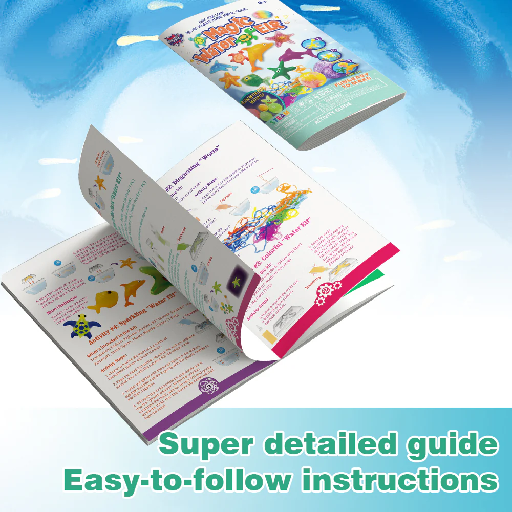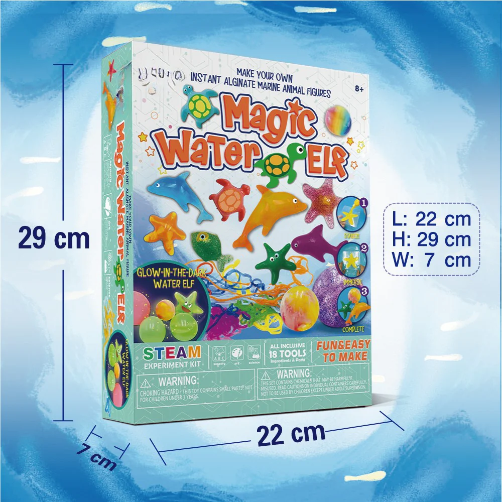 הערכה כוללת: 4 תבניות יצורים ימיים, 5 בקבוקי תמיסת סודיום אלגינט (אדום, צהוב, כחול, ירוק ושקוף), שקית נצנצים, שקית אבקה זוהרת בחושך, שקית סידן כלורי, כף גדולה, כף קטנה, כוס מדידה, מחט פלסטיק וחוברת הוראות.