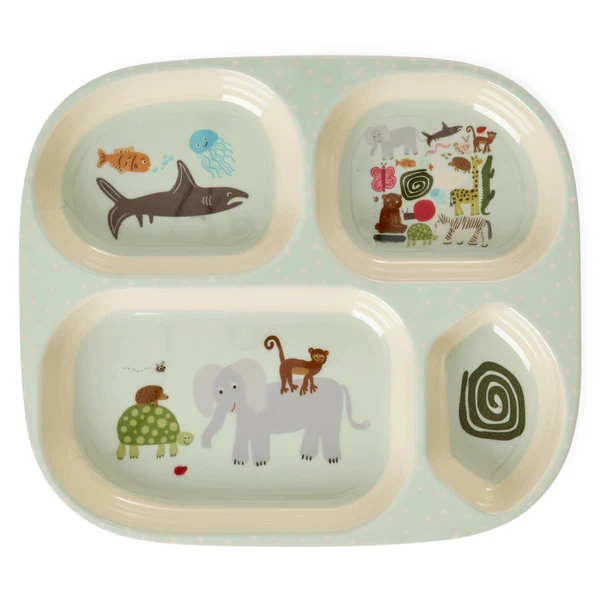 צלחת מלמין מחולקת מצויירת – חבורת חיות ירוק