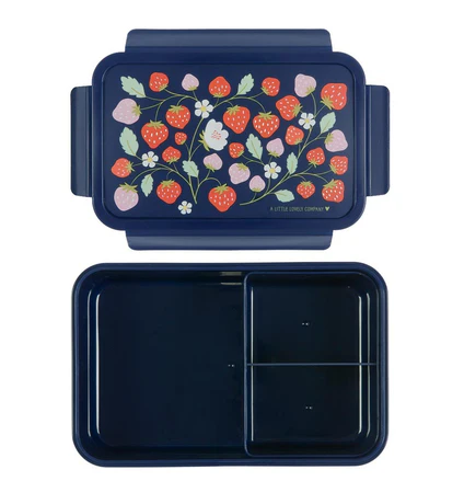 קופסת אוכל בנטו לילדים עם מגש תחתון ותאים נשלפים באיורים מתוקים של תותים.