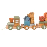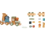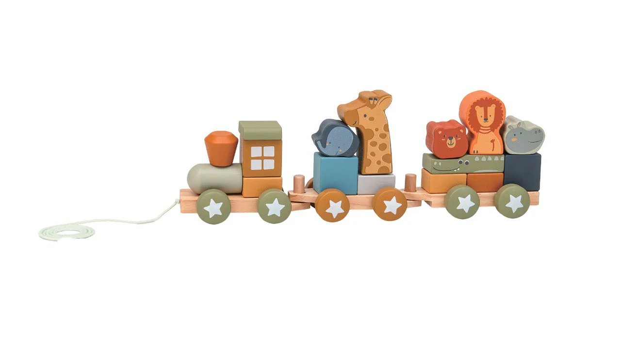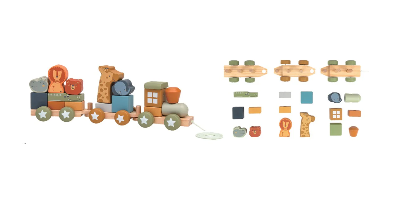 המשחק כולל 19 חלקים: 3 בסיסי השחלה עם גלגלים (מתחברים 1 לשני), 10 חלקי קוביות עץ בצורות ו6 חיות.