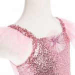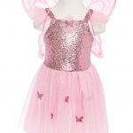 תחפושת פרפר שמלה ורודה עם פאייטים בעיצוב פרפרים וכנפיים.