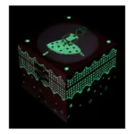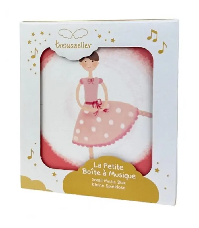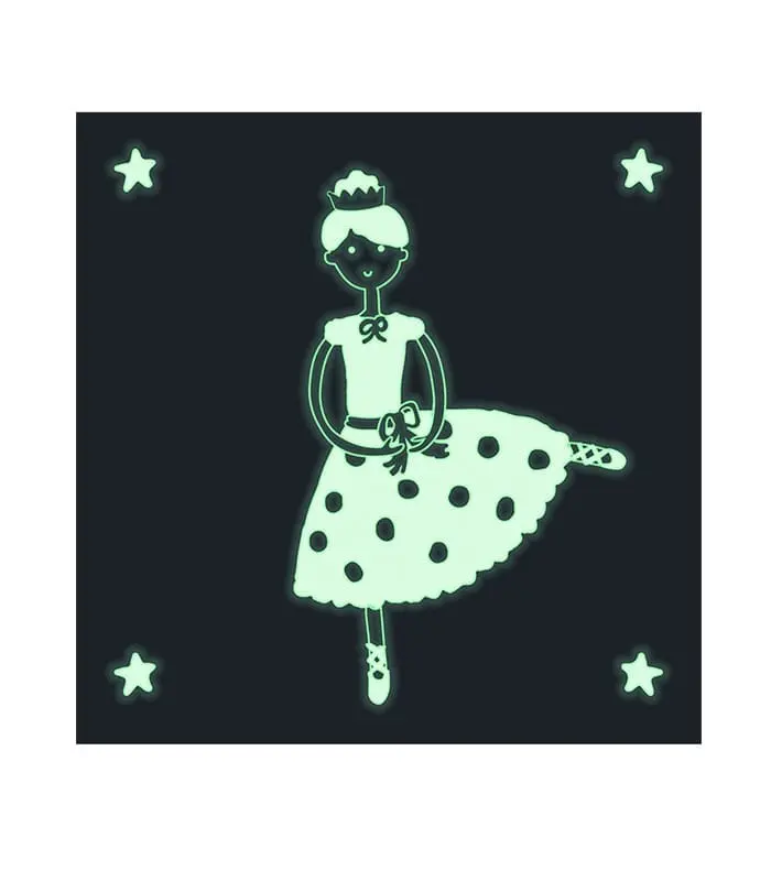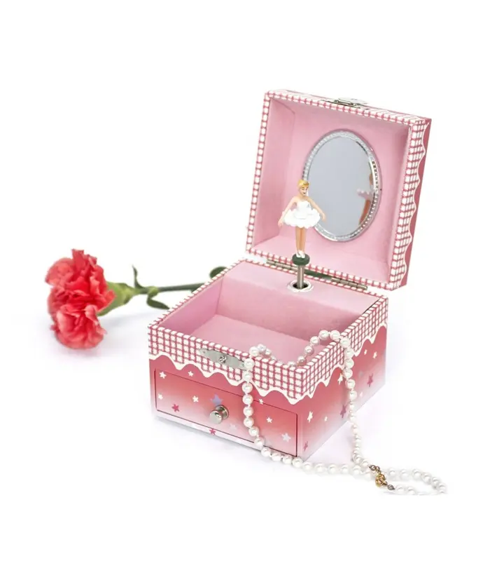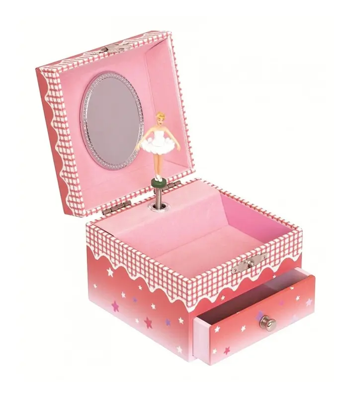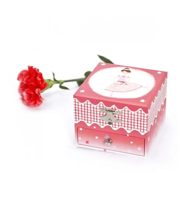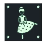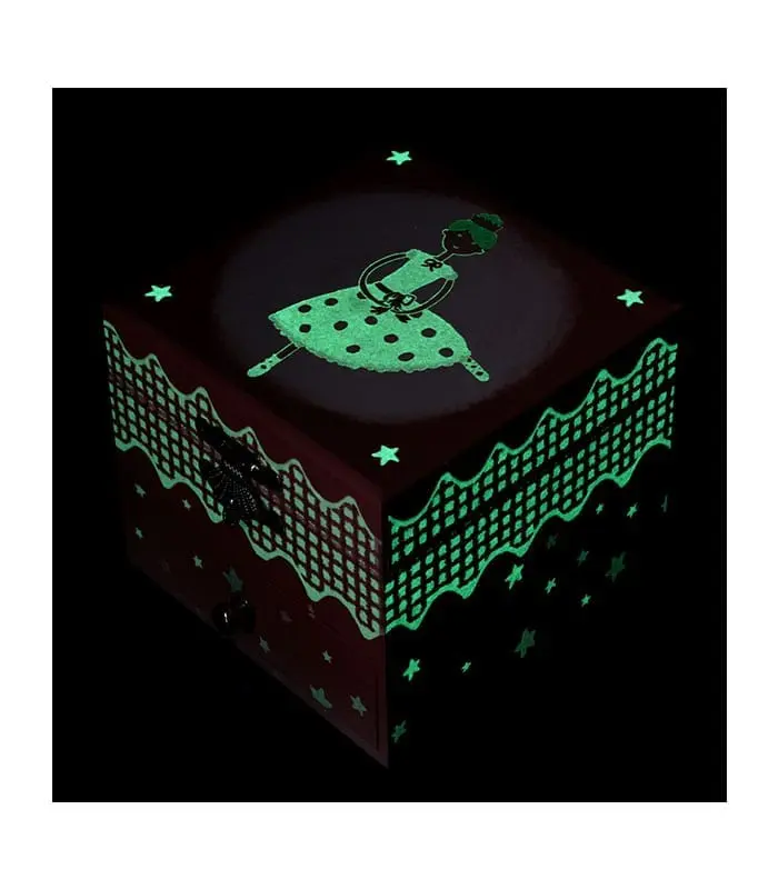 תיבת נגינה מכנית עשויה עץ עם ציור בלרינה וכוכבים זוהרים בחושך.