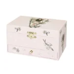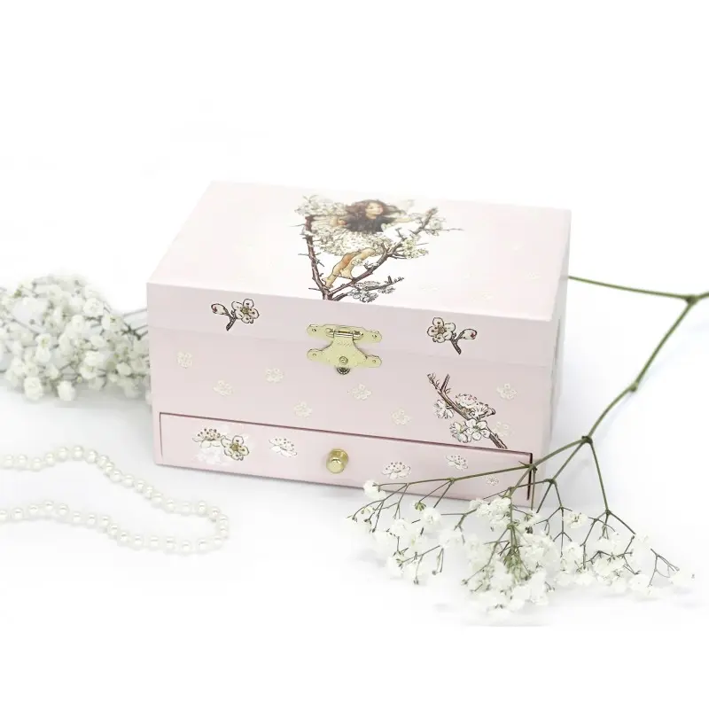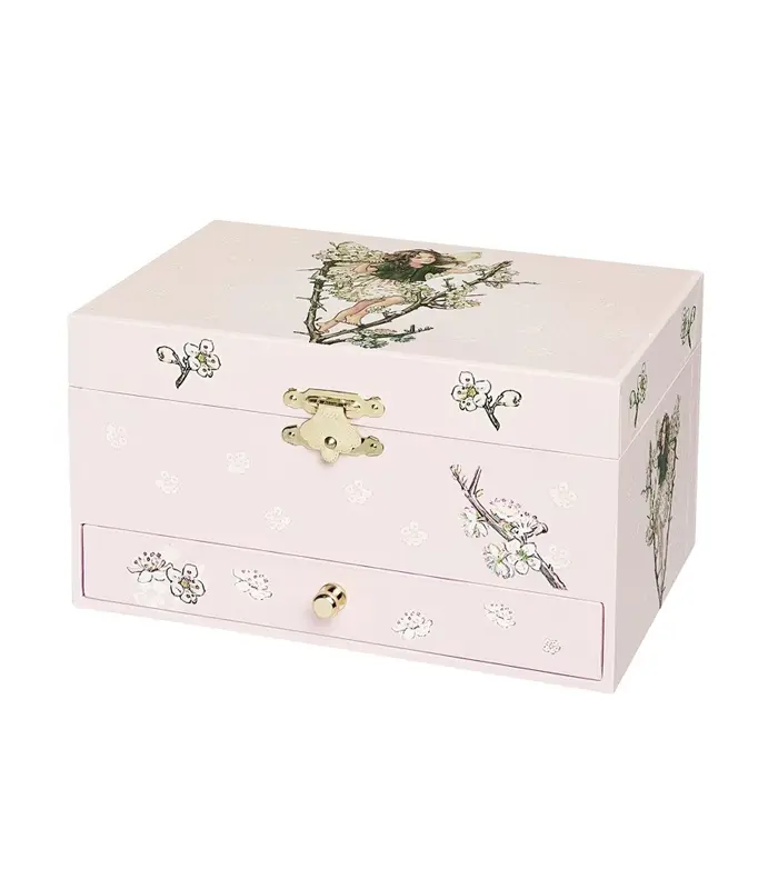 תיבת נגינה מכנית עשויה עץ עם ציור פיה ופרחים זוהרים בחושך.