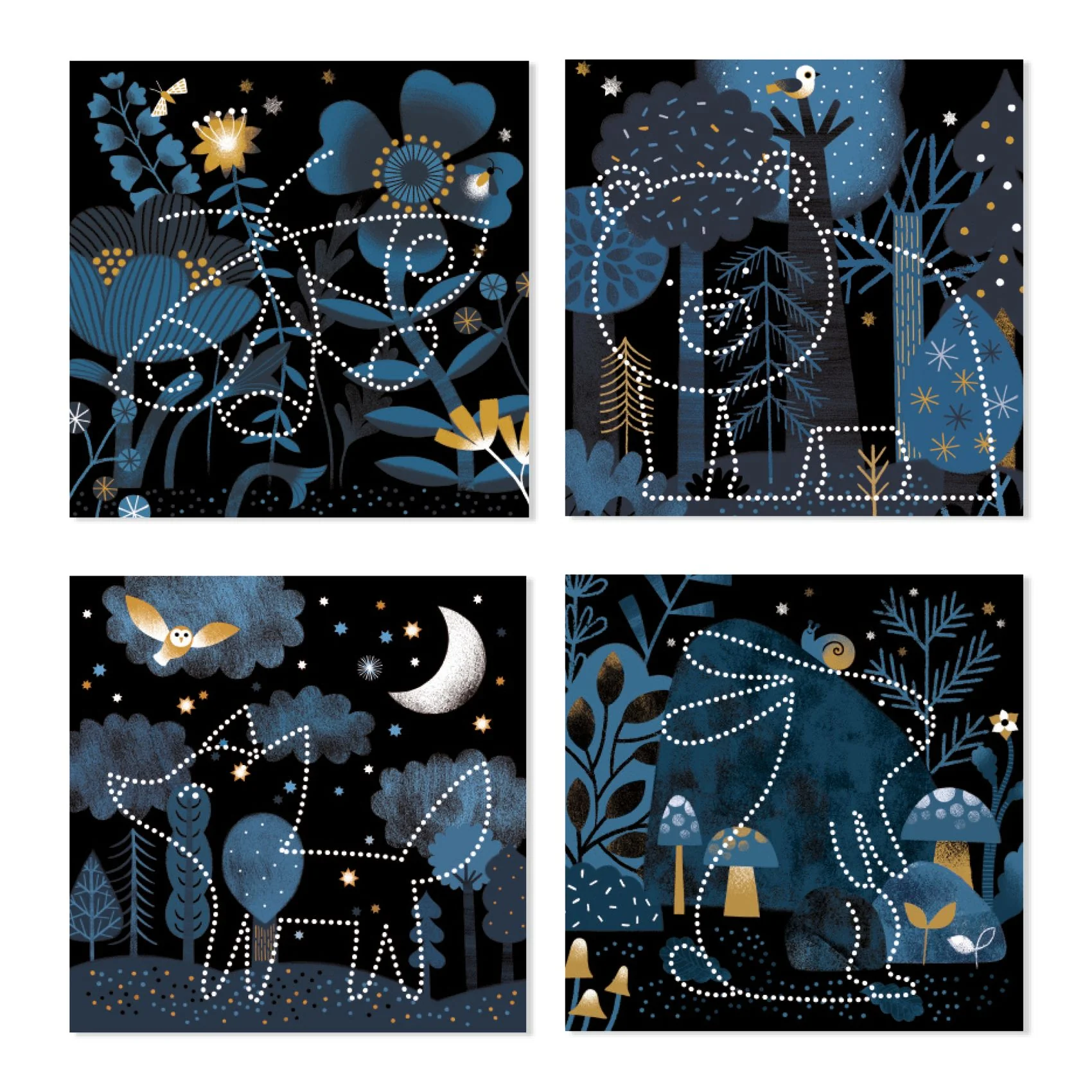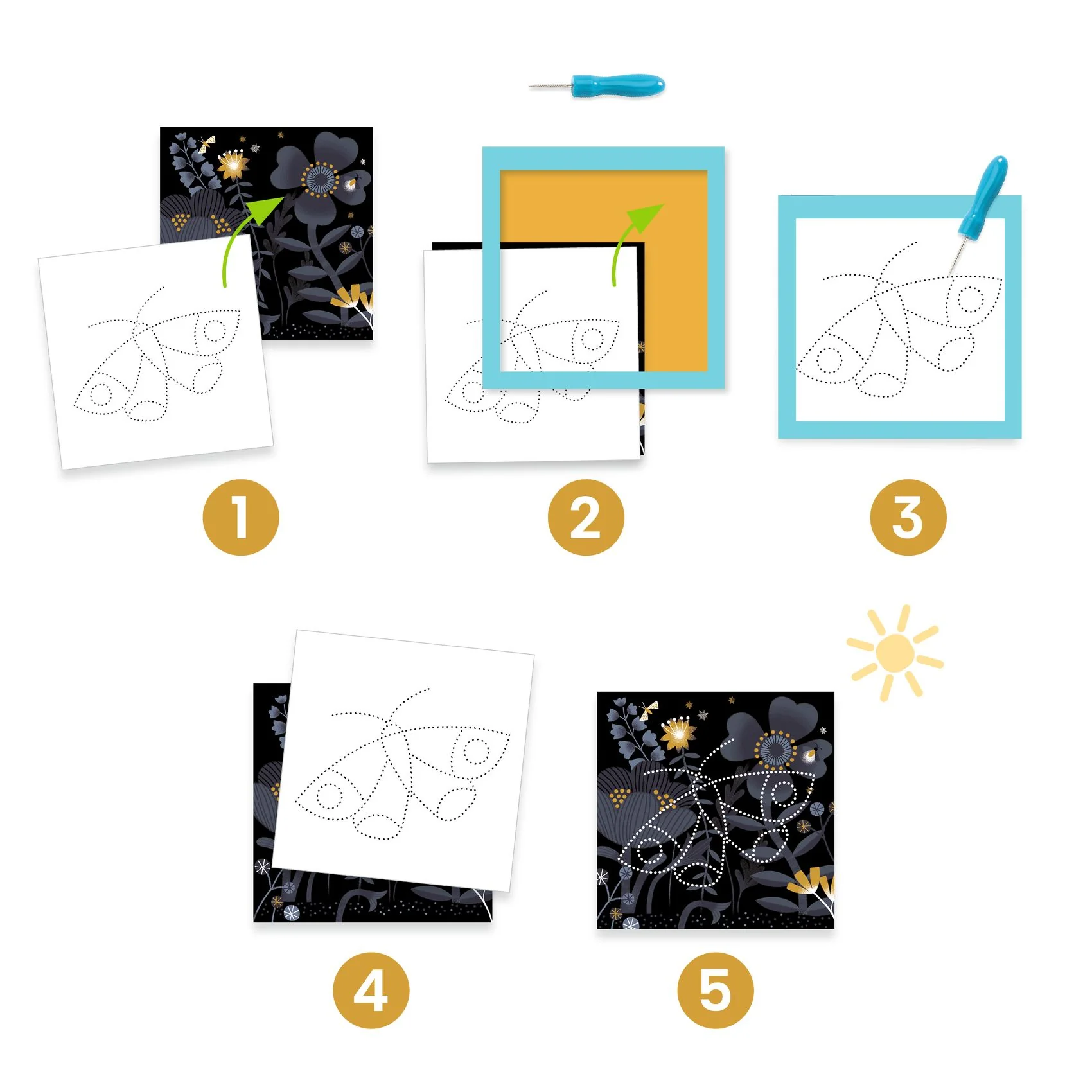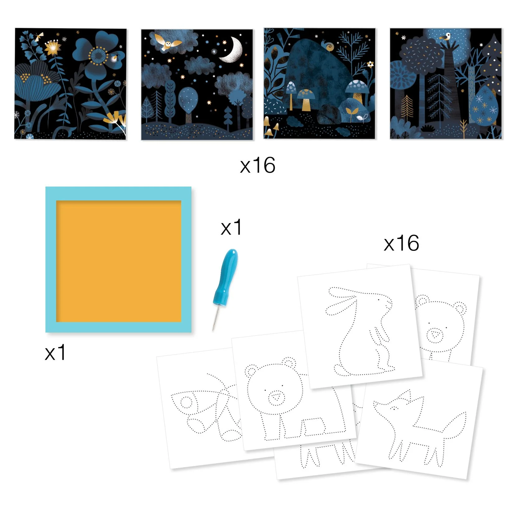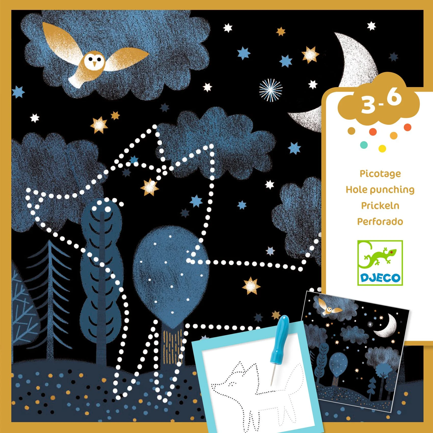 ביצירה זו מסדרים דף עם חיה שבוחרים על דף רקע ובעזרת כלי שמגיע עם היצירה (לא חד!) מנקבים חורים בנקודות המסומנות על דף החיה.