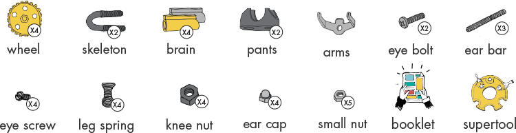 סט הרכבה הכולל חוברת הוראות מאויירת המסייעת להרכיב בקלות דגם ייחודים ממבחר של ברגים, אומים וחלקי מתכת צבעוניים. החוברת כוללת הסברים להרכבה של 3 דגמים ייחודים, ובנוסף ניתן להרכיב כל דבר אשר עולה בדמיונכם.