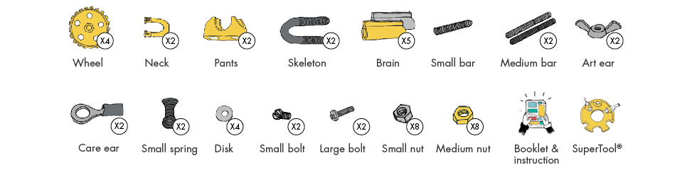 סט הרכבה הכולל חוברת הוראות מאויירת המסייעת להרכיב בקלות דגם ייחודים ממבחר של ברגים, אומים וחלקי מתכת צבעוניים. החוברת כוללת הסברים להרכבה של 3 דגמים ייחודים, ובנוסף ניתן להרכיב כל דבר אשר עולה בדמיונכם.